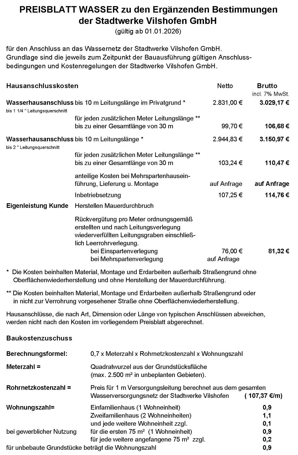 Die Kosten für den Wasseranschluss entnehmen Sie bitte der Grafik.